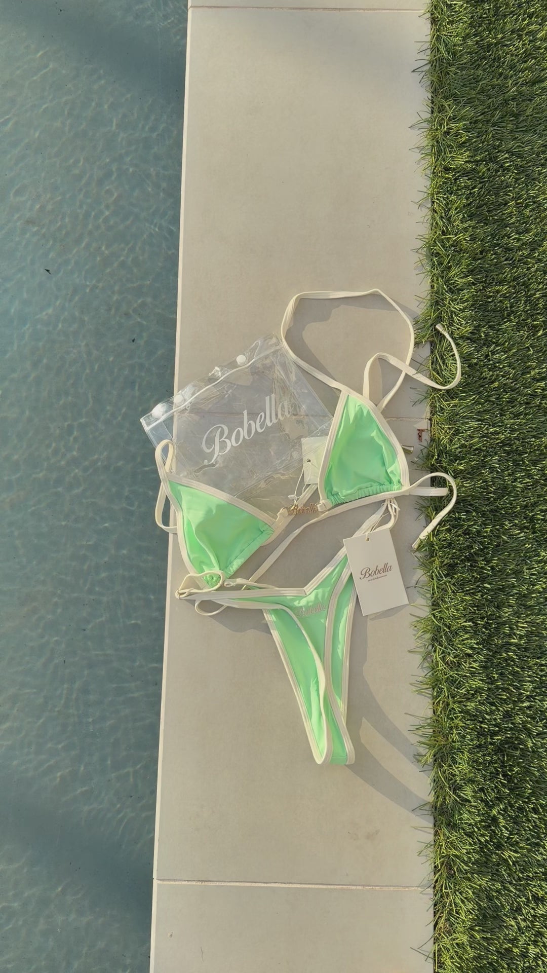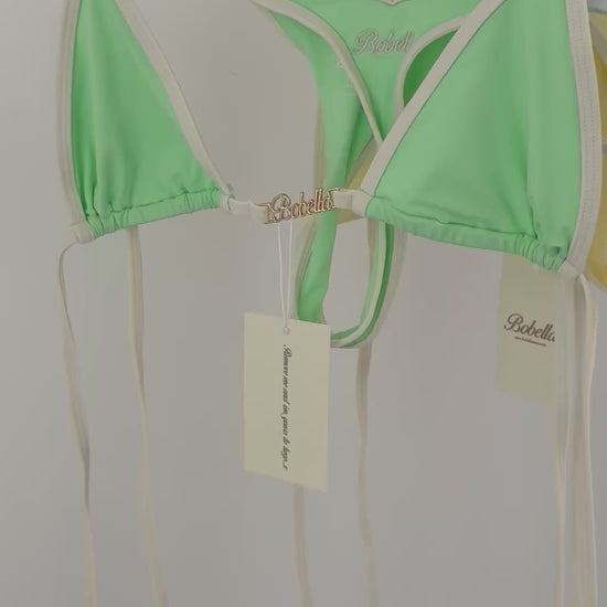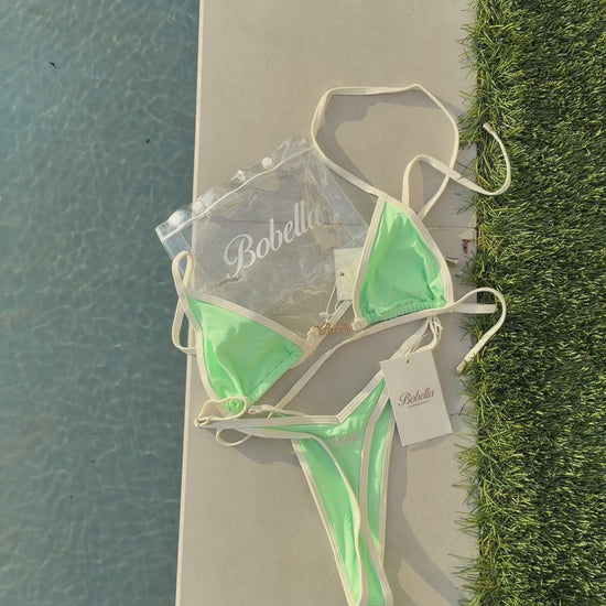 Fresh, bold, and a little bit wild. Menta Sirena brings mint-green energy with a striking cream outline that highlights every curve. The V-cut makes your body pop, adjustable cups keep it comfy and secure, and gold accents add that luxe finish. The kind of bikini that makes you feel like the main character.